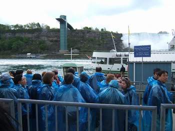 等船进入大瀑布, 每个人都穿上了蓝色的雨衣, 一群蓝雨人. 不过多亏了这件小小的雨衣, 让我们免于淋成落汤鸡.
