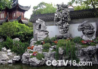 豫园曾被誉为奇秀甲于东南,最早为明代造园高手张南阳设计,是一座揉和了我国明、清两代园林艺术的名园,被国务院定为全国文物保护单位。一进园门,迎面的建筑是三穗堂,抬头仰望,“城市山林”的四字匾额,形象的反映了豫园所处的环境:周围是喧闹繁华的都市,园内则充满了山林野趣。穿过仰山堂,一座大假山隔池相望。山高12米左右,是用2000吨武康黄石堆叠而成,迂回曲折,气势磅礴。豫园的围墙,蜿蜒起伏,顶上饰以龙头,并用瓦片组成麟状,象征龙身,一垛墙如居龙游动,称为龙墙。在我国古代,龙是封建帝王的象征,是不能随便用在建筑物上作装饰的。豫园在建龙墙时已是清末,而且“龙”只有三,四个爪子,是为了避去“五爪金龙”之嫌。这两条龙,龙头相对,中间有一颗珠,被称为“二龙抢珠”。豫园内园系清康熙四十八年(公元1709年)建,占地面积仅2亩许,但山石池沼、大厅堂室、亭轩楼台一应俱全,花墙小廊,布置得宜,益使小园曲折迂回,疏密有致。内园还新建有古戏台一座,俗称"打唱台",也叫"凤舞鸾吟"。戏台依山临水,半跨池上,建筑精致,藻饰华丽。尤其是台前的垂檐,雕刻细腻,涂金染彩,工丽精巧,金碧辉煌。戏台四面的石柱上,分别有描绘春夏秋冬四季景色的对联。正中央悬挂着郭沫若同志1961年游览豫园时写下的诗篇"小刀会址忆陈刘,一片红巾起海陬。日月金钱昭日月,风流人物领风流。玲珑玉垒千钧重,曲折楼台万姓游。坐使湖山增彩色,豫园有史足千秋。"