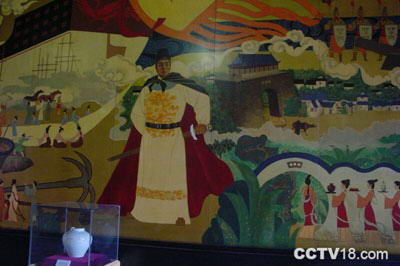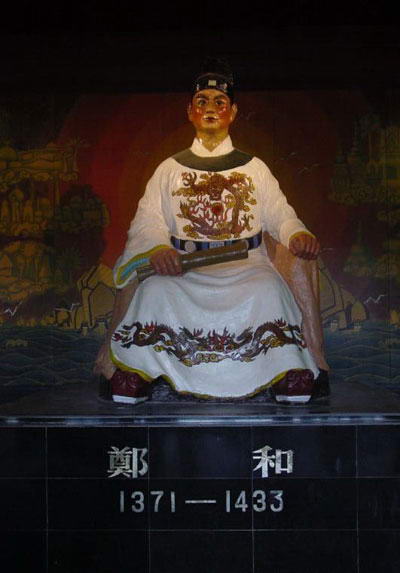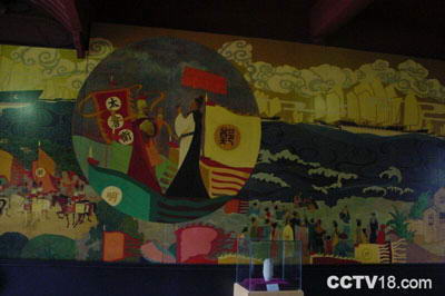 馆内的郑和壁画 二楼陈列着郑和使用的宝船模型和展示当时郑和七下西洋踪迹的电动航海图以及有关实物,折射出郑和这位古代杰出的航海家、伟大的民族英雄的光辉业绩。郑和下西洋开辟了“海上丝绸之路”,雄辩地告诉世人:中华民族在历史上就致力于各国交往,进行文化和经济交流。 |