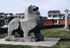 南朝梁雕刻,在今江苏句容石狮村,是梁南康简王萧绩墓前石雕群像。 素有“五山一水四分田”之说的句容市,南倚茅山,北濒大江,赤山湖横陈城西,宁镇山脉透迤境内,地势高坦不一,山川纵横交错。这里,不仅物产丰饶,特产多样,而且名胜古迹很多,除宝华山诸胜迹外,其它还有南朝梁代陵墓石刻更为令人注目。 在句容城西北九公里石狮沟村的开阔平地上,雄踞一对庞大的石兽,其形似狮,故人称其为石狮子。石狮后面不远处还有一对石柱,这就是南朝梁代萧绩墓石刻。它是我国南朝陵墓石刻中保存最宏伟的一处。 这对石兽与帝墓陵前头上长角的石天禄、麒麟不同,头上无角,称作辟邪,特用于王侯墓前。这是古代统治者等级差别的一种标志。“辟邪”,是辟除邪物的意思,是古代一种尊奉的神兽,安置于墓前作为侍卫与仪仗。