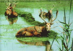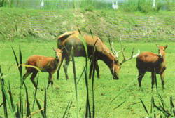 由于种种原因,糜鹿野生种群已在一千年前绝迹,仅剩数百头被驯养在明、清的皇家园林,一百多年前又在一场民族浩劫中被抢掠一空。直到20世纪80年代,在世界野生动物基金会等国际组织的倡议和帮助下,这些流落海外的国宝级珍稀动物才万里迢迢从英国返回故园,在它们远祖生活过的溱湖边重新开始繁衍生息。目前世界上仅有麇鹿2000多头。 |