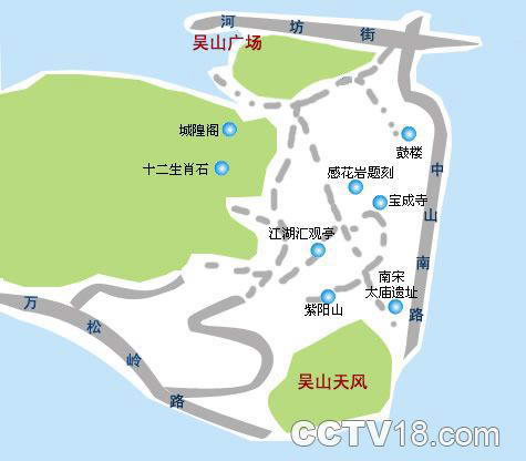 吴山景区,西起万松岭,东到鼓楼,山体蜿蜒起伏,绵亘数里,直插市区。当西湖还是一个与钱塘江相连的海湾时,吴山是环抱这个海湾的一个岬角。沧桑变迁,吴山成了一座风景名山,左江右湖,是登高远眺,纵览西湖风光的最佳之地。 吴山面积约1000亩,虽以风景秀丽著称,但历代以来,山上酒肆遍布、庙宇林立,各色摊点比比皆是,形成杭州民俗文化的一个汇集场所,它与孤山,一雅一俗,体现了杭州文化兼收并蓄的多元性。 本区是市民最喜欢登临的山,也许由于“近”和“俗”的原因,容易亲近。登山环顾,满目尽是古老苍郁的市树“香樟”,翠叶繁茂,生机盎然。史有城隍阁气势恢宏,倘若夜间在此眺望,全城灯火闪烁,与天上皓月繁星争辉,正如明代徐文长所云:“八百里湖山知是何午图画;十万家灯火尽归此处楼台。”