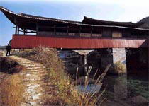 南阳桥,又称玉岩桥,位于泗溪镇岩头村。此桥为伸臂梁木平桥,重檐歇山顶,建于同治九年。南阳桥的构造特点是在溪中建石墩,然后在石墩上叠架木梁,向左右平衡伸展。这种双向伸臂木梁桥可以增加木梁的承托作用,同时还可使木柱在纵向有一定的稳定性。浙江山区很多木桥都采用这种构造。