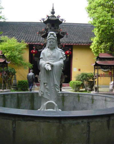 铁佛寺位于湖州市区劳动路中段,因为有一尊宋铸铁观音佛像而得名。 寺分前殿和后殿,前殿正中有一尊铁观音造像。后殿正中陈列一口日本铜钟,后壁镶有元朝大书法家赵孟钍樾吹摹短炷?蚴凫?隆肪薇?L?垡簟⑷毡就?雍驼悦项书写的巨碑,被称为铁佛寺的三件宝。 铁观音造像身高2.5米,重约1.5吨。身向右侧立,发髻高踞,面颊丰满,两手交叉胸前,似谛听梵音。赤脚露趾地站在莲花座上,体态呈S形,而莲花座一反常形,倒扣在地。其造形上承盛唐丰腴遗风,下开宋代俊丽先声,仪态端庄,眉目安详,神姿飘逸,衣褶流畅,整座佛像娴雅婀娜,造工精细,浑然一体,是一尊罕见的艺术珍品。美国、法国、德国、意大利、丹麦、日本诸国,都曾有代表团和艺术家来参观,或题诗、或留言,有的代表团赞誉铁观音是名副其实的“东方维纳斯”。