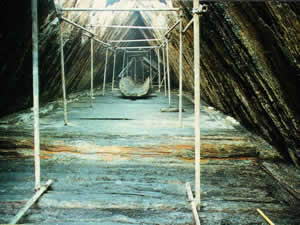 王陵为一座平面呈“凸”字形的竖穴岩坑木椁墓,呈东西向,墓穴全部在岩层中挖凿而成,全长100米,其中墓坑长46米、宽15米,墓道长54米、宽6米左右。墓上建有巨大的封土墩。印山外围四角设有隍壕围护,整个陵墓占地10多万平方米。 木椁均为巨大的枋木构筑成狭长条两面斜坡状,横断面呈三角形墓室空间,现存木结构基本完整,规模巨大,全长34.8米,宽6.7米,高5.6米。内分前、中、后三室,各室间设有门槛和门梁,以及厚20厘米的木质隔墙。这些枋木均三面髹漆,出土时局部地方尚漆面如镜。墓室东端设有长2.5米的甬道,亦用枋木呈两面斜撑状,其高度略低于墓室。中室为棺床,置一巨型独木棺,为国内罕见,它全长6.1米,直径1.12米,棺下填三根方木,整棺内外髹漆。 印山越国王陵的防腐填筑技术十分科学和讲究。墓室木椁建造前,在巨大的岩坑底先铺1.8米左右的木炭层,三角形墓室建于夯实的炭层上。此后,为保护木材,再在其外依次层层叠压,包护厚25厘米左右、约为140余层的树皮,树皮外又填筑厚约1米的木炭,木炭外又包护厚5厘米左右的树皮;墓坑内全部用结构紧实、土质细密的青膏泥填筑至坑口,最后在其上用黄褐色粘土堆筑巨大的覆斗状封土墩,把整个墓坑和部分墓道覆盖起来。封土墩高12米左右,夯层坚实清晰,每层厚7—9厘米。圆形夯窝直径约7厘米。 王陵早年被盗掘严重,墓室内仅出土玉剑、玉镞、玉镇、龙首形玉部件、微型玉管、珠、漆木杖等,以及填土中出土的青铜铎、青铜凿、木杵等随葬晶40余件(组)。 从王陵宏大的规模、豪华的墓室、巨型独木棺、出土的珍贵文物以及墓地四周保存完好的隍壕考证,其时代当为春秋晚期;结合古文献记载,墓主应是句践父亲允常,此陵即《越绝书》记载的“木客大冢”。 印山越国王陵是浙江省继河姆渡文化和良渚文化后的又一重大发现,很多考古资料都是首次发现。1998年5月13日,浙江省文物局和绍兴县人民政府在绍兴县联合召开“印山越国王陵考古发现公布暨保护方案论证会”,并据其重要的文物价值决定进行就地保护,建立越国王陵博物馆。 1998年11月30日,印山越国王陵被增补为第四批省级文物保护单位。后被评为“1998年全国十大考古新发现”。 |