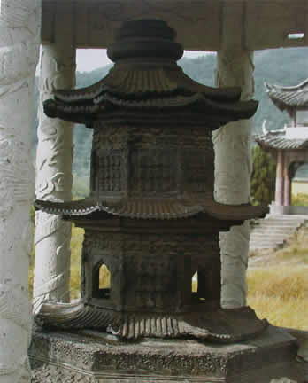 双林铁塔现置于塔山云黄山麓的双林寺中。它铸造于五代后周广顺二年(952年),是我国现存最早的铁塔。塔高约2.20米,共三层,铸有人物、楼阁、动物、花卉和象征“九山八海”的山峰与海的图案,塔外还设有铸着花卉的八面铁围栏。铁塔上的图案,线条流畅,形象生动,结构严谨。距今虽有千余年之久,除局部生绣外,仍然乌黑发亮。 |