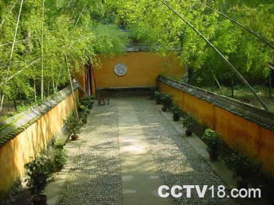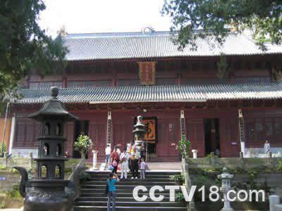 天台山的国清寺位于县城北3公里,景区面积2.4平方公里。国清寺始建于隋开皇十八年(598年),初名天台寺,后取“寺若成,国即清”改名为国清寺。南宋列为“江南十刹”之一,现存建筑为清雍正十二年(1734年)奉敕重修。全寺总面积7.3万平方米、分为五条纵轴线,正中轴由南而北依次为弥勒殿、雨花殿、大雄宝殿、药师殿、观音殿;还有放生池、钟鼓楼、聚贤堂、方丈楼、三圣殿、妙法堂(上为藏经楼);伽蓝殿、罗汉堂、文物室等,构成一个拥有2万多平方米、8000余间房屋的古建筑群。寺宇依山就势,层层递高,既有佛教建筑严整对称的特点,又给人以灵活自如之感。 与其他名刹相比,国清寺的自然景观和人文景观更具有地方特色。 从自然景观来看,国内大部分古刹均选址于三面环山的谷地(如宁波天童寺、普陀法雨寺、杭州灵隐寺、嵩山少林寺等),而国清寺却坐落于四面环山的“五峰层叠郁苕绕,双涧回环锁佛寮”世外桃源式的地理环境之中。出城关三五里,先见“雁塔高排出青嶂”,高达59.3米的隋塔忽隐忽现,直到国清寺“南大门”木鱼山下,才窥塔身全貌。而国清寺仍是“养在深闺人未识”。转过寒拾亭,只见“隋代古刹”一照壁,古刹山门不知开于何处。等过丰干桥,向东数步,方见古刹山门。原来国清寺山门一反常规,朝东开而不朝南开。进山门转直弯,甬道两旁浓荫蔽日,修竹夹道,平添了深幽神秘的气氛。进弥勒殿,国清奇观“到眼宛如展画屏”。这就是国清寺匠心独运的建筑布局的“起、承、转、合”。