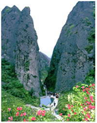 铁门峡,内狭外宽,直至好溪边的孔雀岩、仙掌岩之间。内有类似葫芦谷数处,是芙蓉嶂的精华所在。明李铁城有诗云:“鸿蒙古峡闷仙峦,道眼探幽集大观。夹峰芙蓉通石室,蟠龙杞菊老严湍。冯将世事忘吾我,恍有天风挟羽翰。如遇浮丘携手去,更于何地煮金丹。” 螺丝岩,从芙蓉峡口向紫芝坞内眺望,其中心,上有一巨石凌空而立,形似田螺,俗称螺丝岩;如果登上芙蓉嶂之巅,向紫芝坞俯视,此岩又像狮头糜身狼蹄牛尾的玉麒麟。古人信神,称它为丹鼎。明郑汝璧《游仙都记》“凡数转,径逾窄。徒拥一峡,谽蚜相向,石门中开,可丈许。稍进,则二柱耸峙,忽辟而峭,两山抱之。中见一石如丹鼎,上员下洞,可坐百人。” |