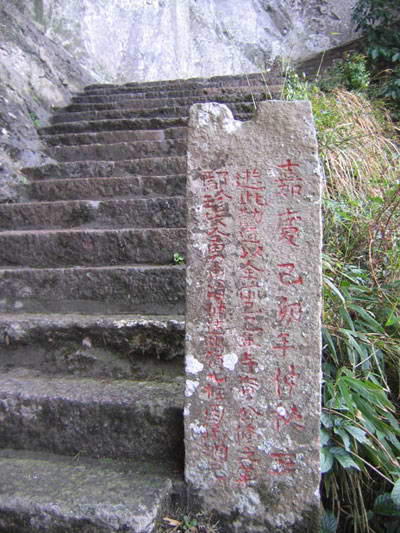 名山室宋代石阶 宋代石阶一路名人书卷,漫步走上青石阶,这些布满青苔的石阶经过岁月的打磨,反而更有了古道悠长的味道。这是我国少有的一条保存完整的宋代古道,俯身来看就不难发现,这些保存较为完整的古道上,每一个台阶上都工整地刻着字,且大多为人的姓名。据专家考证,这些人正是当初捐钱捐物的修路者,有的石阶上还写着当初他们捐物的名字。有的大块石阶上只刻着一个人的名字,被认为是捐了不少钱财的富人。 从沿路山崖密集的题刻可以看出,北宋到南宋年间,名山室的香火尤为鼎盛,包括宋代状元许将、进士陈禅道、清代教育家余潜士、学者黄任等在内的历史名人都曾在此读书修身。