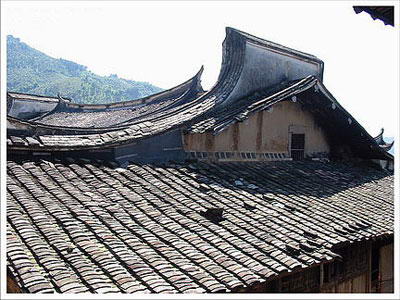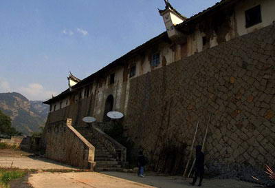 东关寨构造 东关寨寨门内是第一进双层楼房,背倚寨墙,坐西向东(内向),面对厅堂。构架为穿斗式,用通柱(楼上下层支柱只用1根),又坡顶,前坡向内出檐,后坡覆盖寨墙,正脊为鹄尾。楼上下均为5开间。楼下一瞬间为寨门通道,前廊既接连前院披舍,也通连左右别院。楼后与东关寨寨墙门架设廊道,宽近2米,沿寨墙内向环绕全寨,配以寨墙上开的了望(射击)孔,用以防御外来盗贼。楼房前为石铺庭院,院正中与左右廊房都设有石阶,供登厅堂。厅堂、门楼房、左右廊楼构成第一井,组成单元小区,既封闭又与左右前后通连。