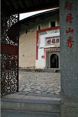 桥下不远处,深潭碧水,古榕葱茏,如伞如盖。如果站在大门对岸的村道上回望振福楼,可见振福楼的屋面正好位于峡谷两侧的山峦之间,楼不高不矮,不显不隐,正好起到两山之间"过渡"的作用。可以说,以振福楼为中心形成的秀美而幽静的山水田园环境,是天地人溶成一体的杰作8集电视连续剧《土楼人家》的片头,就选取了这片风景为主体画面。