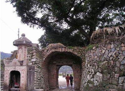 冷城古堡格局 一条溜光滑亮的石板街,自东贯西,将城内建筑布局一分为二,小巷甬道纵横错杂,置身其中,如入八卦阵不知所向,庭院天井地面皆由鹅卵石镶嵌,辅加条石左右相夹,平整匀称,走Z字形,延伸到各庭院;街中心地面由鹅卵石拼砌的八卦图,尤其引入驻足,那历历可数的图案,天造地设,浓缩着一个小小的乾坤,抬头仰望有一宅门横匾“紫气遥临”,漫漶可辨其书法沉稳健爽、意味隽永。城内原保存有明清古民居大宅厝二十余座,可惜在1933年遭国民党兵团烧毁,几乎夷为平地。如今遗留下的门楼飞檐斗拱,依稀可窥其当时的规模与精巧。此外,冷城古堡按地形划分为四境,每境均设供奉神明。城东门属东麓境,建有七圣庙和泗洲文佛。据州志载:“神名赵昱,宋开庆元年,县令李姓者自蜀奉香火至此,人为立祠,称七圣者,盖同七人入水斩蛟除害。”史书的记载和神话传说无不给冷城披上一层神秘的色彩。今天,七圣庙已经不复存在,而建于宋代的泗洲文佛石屋,依然完好如初,须弥座上雕刻有双狮戏珠、人物、花卉,造型古朴、生动,神龛被香烛熏染得发黑;城西门为金鏊境,有庙称“杨八宫”,详细史料无从考查;城南门称庆云境,有建于清道光九年的顺懿庙,供奉“顺天圣母”。村上每有怀孕妇女,必到此庙祈愿还香,保佑母子平安。庙坛修葺一新,神像彩釉鲜艳,吸引众多香客。每逢春节期间,地方信士搭台公演,并大举出巡,鸣锣开道,后随无数旗幡,礼炮轰鸣,前呼后拥,蔚为壮观。旧时有俊俏孩童,扮成剧中角色,立在大人肩头,称“踏跷”,此仪式之隆重,一直闹到十五元宵,方偃旗息鼓,设宴祈福;北门系东牙境,因旧时风水之故,不设城门,俗称“衙门里”,供奉“齐天大圣”宫。每岁农历七月十五,在宫中演戏三昼夜,四乡八里村民聚而欢堂,形成庙会,今戏台仍在,屏风如画,中有天井四四方方,戏廊接连二十余米,古风民俗犹存。“大圣宫”还是福鼎党史上著名的“冷城暴动”会址,曾为福鼎民主革命谱写过光辉的一页。