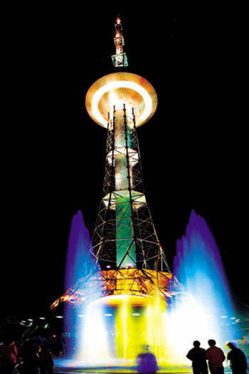 该塔是胜利油田广播电视中心的无线信号发射中心,同时具有观光、餐饮、娱乐等功能。地下部分为胜利电视台发射机房,一层设有迎宾厅和贵宾厅,二层为多功能展厅,三层为商务中心,在塔的112~131米处建有最大直径为27米的塔楼,塔楼上设有旋转观光餐厅和露天观光平台等。塔内设2部每秒运行2.5米的高速电梯,从底层至塔楼需53秒;旋转餐厅坐行一周约45分钟。该塔最佳日接待量300人次,最大日接待量1000人次。登临塔楼,极目远眺,百里油城尽收眼底。夜幕下,在数百盏彩灯的装饰照耀下,高塔更加巍峨璀璨。 |