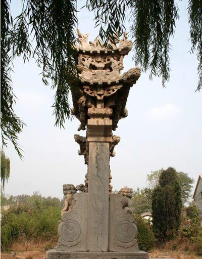 整个坊顶有12条垂脊,每条垂脊角的上、中、下部都刻有1只昂首眺望的龙头,共36只。在3条正脊两端都有1只尾巴上翘的龙,口衔正脊,相对升腾。特别是在坊顶正中位置刻有1只背负宝瓶的麒麟,方向与坊顶平行,矫健昂首,凌空欲飞。 在次楼匾的下边,还有4幅谐音吉祥祈福动植物图像,如:六(鹿)合(鹤)同春、太师(狮)少保、挂印封(蜂)侯(猴)、父子拜相(象)。雕刻动物活灵活现,情趣盎然,生动传神。背景中的山林、怪石亦用高浮雕处理,给人以很强的艺术感染力。 在两条中柱的东西两面,均刻有1只圆雕雄狮,勇猛刚劲,形态各异,高踞于底座的基石上。坊上雕刻的花鸟繁多,千姿百态,栩栩如生。在次楼匾上方,刻有四季花鸟图,均用高浮雕表现,随风翻卷的荷叶,高高凸出画面;栖落在花丛中的小鸟或动或静,神态各异。在两边柱的东西两侧,刻有牡丹、玉兰、芭蕉、绣球等花卉;边柱外侧分别是浅浮雕的风竹、雨竹。这些花草画面结构严谨,富有诗意。 总之,整个石坊内容虽多,但繁而不乱,主次分明,安排得体。既是一座高大的古代建筑,又是多种雕刻技法的有机组合,可谓工艺超群。它凝聚着前辈艺人的心血,显示了人民的创造才能。该石坊虽历经百余年的风雨剥蚀,仍不失为一座完美的艺术瑰宝。“天下无二坊,除了兖州是庵上”,这句民谚是对庵上石坊的赞誉。 |