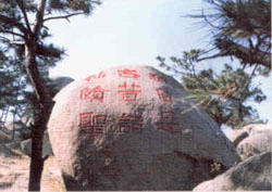 (峄山摩崖刻经) 在邹城东南6公里峄山上。刻经两处:一处在五华峰“光风霁月”石上,另一处在山腰乌龙石妖精洞侧。五华峰刻经纵2.5米,横6.2米,7行,共98字,由于风化残损,现存72字,内容为《文殊般若经》。妖精洞刻经,面东,竖高4.5米,宽3.1米,经文7行,98字,现存75字,内容为《文殊般若经》。右上角有题字一行“斛律太保家客邑主董珍陀”,考《北史》、《北齐书》均有斛律太保记述,证明峄山刻经刊刻于北齐武平三年(573年)。刻经书法以隶意为主,结体严谨,雄浑简穆,端整古秀,是北齐刻经的上乘佳作。峄山刻经现为山东省重点文物保护单位。 |