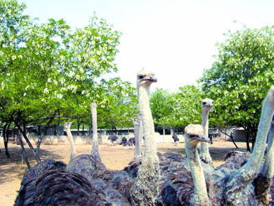 金鹭鸵鸟游乐园简介 金鹭公司在以特种养殖为主业的基础上,利用现有的自然资源条件建成了金鹭鸵鸟游乐园;金鹭鸵鸟游乐园区内鸵鸟悠闲时的神态以及成群奔跑时的壮观景象极具观赏价值,金鹭鸵鸟游乐园内还大量种植了美国提子和其他观赏类植物,因此,河南省旅游局批准此地为“金鹭鸵鸟游乐园”旅游观光景点。登上金鹭鸵鸟游乐园内大沙丘的观光亭,可一览养殖园的全景,当远处成群的鸵鸟展翅奔跑时,黑色的鸵鸟群就象黑色的云在滚动,令人想起这些鸵鸟在它们的—非洲原始草原上生活的景象。
