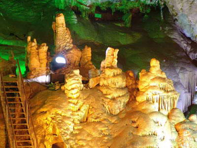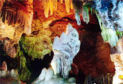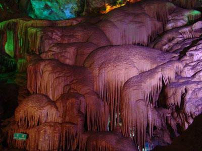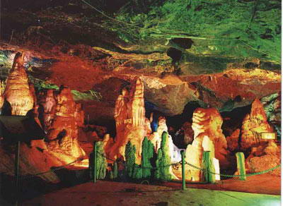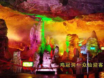 鸡冠洞发现于清朝乾隆年间。旧《栾川县志》称:“鸡冠洞,有四殿,如龙蛇之窟”、“蝙蝠如织,险象四伏”、“有樵者,操刀持棒,结伙秉烛而入”、“深幽莫测,惧而返。”。鸡冠洞蛰伏莽莽群山之中,蒙上了神秘莫测的面具,固拒来访,从此与世人隔绝。 鸡冠洞被誉为“北国第一洞”。时值盛夏,鸡冠山遍披绿锦、满目苍翠。当我们登上318级石阶,站在幽深静谧的鸡冠洞口时,无不大汗淋漓。而入得洞内,迎面扑来的习习凉风令人神清气爽、暑热顿消。待置身色彩斑斓、瑰丽神奇的钟乳石世界时,已是颇有寒意了。 洞内峰回路转,曲经通幽,景观布局疏密参差,钟乳石形象各异,姿态万千。洞内旅游资源丰富,洞中共有景点168个。尤其是“众仙迎客”、“金鱼渡仙翁”、“贵妃出浴”、“玉兔望月”、“海豚戏珠”、“鲤鱼戏水”、“八仙拜佛”等88个景观,姿态奇异,形象逼真。