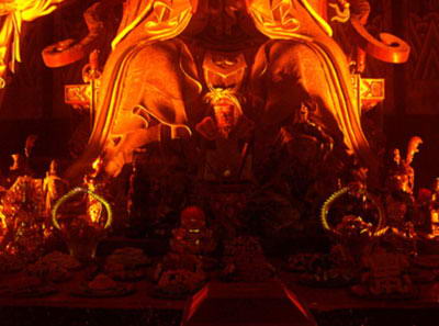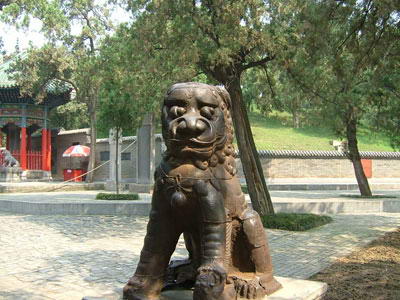 关林拜殿为5开间卷棚顶明代建筑,是举行祭礼时谒拜的场所。殿中间有乾隆、慈禧亲书的匾联,西端竖立着高35米的关羽大刀。大殿与拜殿相连,面阔7间,进深3间,高约20米,总面积700平方米,是关林最大建筑。庑殿顶,琉璃瓦,檐角饰以神将,悬以铁马金铃。檐下斗拱华丽,朱门雕窗。正门两侧木雕有桃园三结义、三顾茅庐等13幅故事画。 大殿是关林最雄伟的建筑,面阔七间,进深三间,高约20米,总面积为760平方米。庑殿顶上,琉璃瓦覆盖,五脊横立,六兽扬武,飞檐斗拱,朱柱盈围;四檐角饰以庞涓、韩信、罗成、周瑜四神将,悬以铁马金铃。殿内暖阁三间,透雕花龙。大殿正门上,有木刻浮雕关公故事图:桃园三结义、三英战吕布、水淹七军、三顾茅庐、单刀赴会、挑锦袍、斩颜良、诛文丑等共十二幅,还有二龙戏珠、凤凰戏牡丹、龙戏凤等图案,刻工精细,构图美妙。 二殿是五开间庑殿顶建筑。殿内正面塑"关羽怒视东吴戎装像",关羽长髯飘洒、端庄威严,关平按剑于左,周仓持刀于右。前檐下绘有斩颜良、诛孔秀、大战夏侯敦、古城会等故事图。后门上方绘有"华容道义释曹操"、"东吴赴宴"、"水战庞德"的故事,形象地反映了关羽骁勇善战的历史画面。 三殿是五开间的硬山式建筑,规模较小,又叫"寝殿"。殿檐下有"三战吕布"、"威镇荆州"、"战长沙"三幅大型故事图。前枋上还有九幅小型故事图。斗拱的昂首都雕成龙头,彩饰绚丽异常。 关冢们于后部,高10米,占地250平方米,平面作八角形。向南有石墓门。相传关羽首级即埋于此冢内。冢前有林碑,高4.8米,碑额题"敕封碑记",碑阴为董笃行所撰之《关圣帝君行实封号碑记》,其内容为关羽的生平、封号以及建庙的情况。 关林大门前有石狮一对,高2.7米,为明代作品。仪门前有铁狮一对,重三千余斤,乃铸于明代;拜殿东端悬有明代大铁钟,两端竖立有关羽的大刀;中间有乾隆、慈禧亲书匾额;拜殿前月台上,放置明代铁花瓶一对。 关帝冢平面为八角形,高10米,占地250平方米,外筑围墙。冢前石碑高4.8米,下有龟趺,上有雕龙碑首,额题九叠篆书《敕封碑记》,是康熙皇帝给关公追加封号所立碑。护碑亭作全木构八角形,为八面起坡歇山顶,斗拱枋椽交错勾连,构筑奇巧,别具一格,是清代亭式建筑之典范。碑亭前有明代所立的石供案及石牌坊,石牌坊高10米,宽6米,3道门,正额题“汉寿亭侯墓”5字。 关林已辟为洛阳古代艺术搏物馆。庙内两侧长达90米的长廊,分别为碑刻墓志陈列室、石刻艺术品陈列室。共收藏陈列历代碑刻、墓志、石刻艺术品近2000件,反映了我国古代石雕艺术的风貌.尤其东汉石辟邪、北魏升仙画像石棺、隋代石狮等,更是稀世珍宝。碑刻、墓志近1000件,其中许多涉及到古代重大历史事件和重要历史人物,均有补史、证史之价值,可谓一部“石史”,并有较高的书法艺术价值。 |
