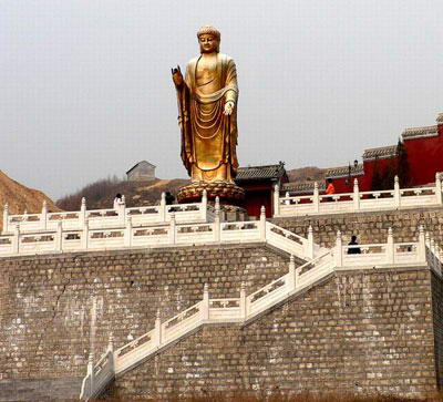 金佛礼佛坛为瞻仰金佛最佳之处。东为“福慧坛”,在此拜佛许愿可增福添慧。西为“康寿坛”,在此拜佛许愿可健康长寿。中为“礼佛坛”,在此许愿,心想事成,万事如意。建筑设计创意充分体现佛教胜地的文化气息,礼佛坛在大佛圆顶装藏之日,惊现灵音,于坛中心拜佛,回声充耳,佛音传送,法力降身,成为佛教胜地绝无仅有的奇迹。 佛山金佛背靠佛都山,面对佛泉河,青龙白虎为伴,立佛讲法,巍峨高耸。金佛总高158米,金佛身高108米,莲花座、金刚座高45米,为天下第一佛。敬建金佛的创意来自前佛教协会赵朴处会长的“五方五佛”。中原虽有龙门石窟卢舍那佛,与佛都山金佛相比有五点不同:龙门石窟卢舍那佛为石佛,坐象、双臂残缺、手印难以考证;佛山金佛为金身,立像、完整、有明确的说法手印,具有鲜明的时代特征,是中华民族优秀文化的生动体现。“金佛卢舍那,佛都曼陀螺”。佛山金佛慈祥庄严,灵竟似有声,充分体现着绵音悠长、普度众生的意境,堪为绝唱。 “五佛至尊卢舍那,十界供奉曼佗罗”。“毗卢世界”,围绕金佛,依照卢舍那佛方位理念,在金刚宝座、莲花宝座近万平方米的空间里,展现“五方五佛”及数万尊护法菩萨、金刚、罗汉、天女的宏伟场面,造像之多、之精美,而局之如法避仪,乃今日天下第一毗卢世界。