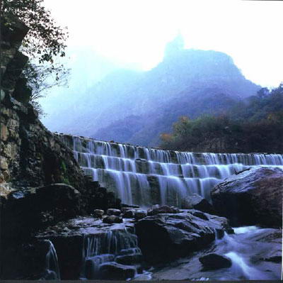 八里沟大瀑布,因位于八里沟而得名,又因瀑布的豁口如龙口,又称龙口瀑布。瀑布落差157米,雨季宽20米左右,平时有5米左右,一年四季水流不断。一挂飞瀑,凌虚而下,咆哮奔腾,山鸣谷应,飞珠溅玉,异彩纷呈,磅礴多姿,气势恢弘,被誉为“华北第一瀑”。远望素帛飘渺,节节下泻;近看明珠闪烁,白帐飘落,身临瀑下凉气袭人,使人有“赤日行空午不识,炎热酷暑汗自收”之感。该瀑布还有一个最大奇观。若天气晴朗,阳光直射(上午8点-下午2点)可以看到10余米高的彩虹,七彩俱全,十分壮观。正如清代大学士孙诠所说:“访其侧下悬崖坐,贪看飞泉不肯行。”而瀑布下方的青龙潭因瀑布落入潭中,泛起波涛,似青龙出入水面而得名。