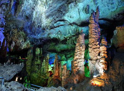 隐水洞洞内景观 隐水洞全长5180米,洞内景观丰富多彩、奇特壮丽,其独特的岩溶地貌,造型之逼真,体积之巨大,在游览洞穴中都是罕见的,是通山县乃至湖北旅游中最浓墨重彩的一笔。隐水洞的游览分三部分:上游1/3乘船观光,中游1/3乘小火车游览,下游1/3步行零距离接触古老而神奇的岩溶地貌,独特的游览方式亚洲第一。