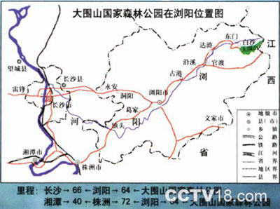 大围山国家森林公园位于湖南省浏阳市东北部,距省会长沙118公里。它以森林茂盛,资源丰富,风景秀丽,气候宜人,被称为“湘东绿色明珠”。1992年经林业部批准为国家森林公园。大围山国家森林公园面7万余亩,境内群山环抱,立峻挺拔,土地肥沃,雨量充沛,植被丰富,种类繁多。原始次生林和人工林浑然一体,形成一片绿色的海洋。植物种类有23个群系、3000多种,列入国家一、二类保护树种有17种,已发现野生动物60余种,列入国家一、二类保护珍稀动物达14种;森林中繁殖的彩蝶打1200多种,堪称“天然动植物博物馆”。 大围山国家森林公园以“秀”著称。在崇山峻岭和茂密森林之间,镶嵌着无数奇峰异石和100多处流泉飞瀑。山得水而秀,水因林更美。这里春天,鸟语花香,流水欢歌,生气盏然。盛夏,登临海拔1515米的五子石峰,满山杜鹃,姹紫嫣红,堪称一绝。深秋,红枫尽染,与青松翠竹相映,五彩纷呈,令人陶醉;若秋高气爽,伫立海拔1607.9米的七星岭顶峰,极目远眺,群山莽莽,层恋叠嶂,晨观日出,晚看落霞,高山壮丽景色尽收眼底,使人心 旷神怡,豪情满怀。入冬,遍山玉树淙枝,银妆素裹,好一派北国风光。由于山高林密的地理特点,构成“夏无酷暑,冬无严冬”的森林小气候,使大围山具有“天然空调”、“大氧吧”的优势。这里年平均气温11。4度,年相对湿度85%以上,夏天平均气温20度--28度。特别是这里空气清新,馨香沁人,水质优良,能满足人们保健、美容、延年益寿和回归大自然的渴求,是十分理想的休闲、度假、旅游、会议的胜地。