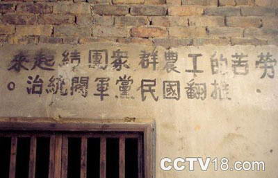 红军墙标语 红军村和红军墙 红军村位于严塘镇湾里村。1931年4月,县苏维埃政府迁此,同年冬撤离。其标志性建筑为茶陵县苏维埃政府旧址,该建筑系民房,前后2栋,中有天井2个,有房间24间,建筑面积808平方米,砖木结构,风火垛饰以彩塑,前饰彩塑檐带,同时还有红军商店、红军医院、红军食堂、红军宿舍等建筑物。县苏维埃政府迁离后,房主用田泥、白粉涂抹厅堂及外墙墙壁,使当时“茶陵县苏维埃政府”门牌、下设的“财政部、文卫部、军事部”等机构及室内地图、宣传画和内外标语基本保存完好(劳动部、土地部、工农检查委员会、政治保卫局、工会、妇女委员会、反帝大同盟等机构的标牌已毁)。还有中央、湘赣、赣皖、湘鄂赣等8个苏区的地图2幅,《全世界无产阶级联合起来呵!》《劳苦工农大众团结起来,反对帝国主义瓜分中国!》的墨线宣传画 2幅,“反对帝国主义瓜分中国!”“劳苦的工农群众团结起来,打土豪,分田地,筹款子,建立革命根据地!”等标语5幅。1985年,县政府组织了一次维修。 |
