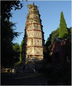 湘山古塔始建于宋代,初名“永怀塔”。古塔系楼阁式空心砖体,六角,七级,铁葫芦顶,连基座到塔顶,共九层,高约13米,入口门楣上镌刻“湘山宝塔”四字,左右两侧镶嵌对联:“月携塔影天河去,我载琴声鹿原来”。塔身中空,登上塔顶可俯瞰炎陵山城全貌。塔外部逐级镶有“八仙过海”等浮雕,清代工部主事尹荣福到此游览,留下了“残霞飞殿角,落日挂林端。塔影连天碧,山光入水寒”的诗句。 1984年10月,湘山古塔被株洲市人民政府列为市级文物保护单位。 |
