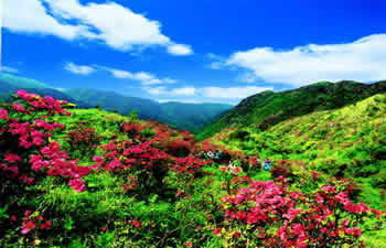 从山脚沿紧慢98盘而上,可以看到受气候影响,植被分布呈明显带状特点,依次是竹海、原始森林、灌木、草山。景区内丘峦起伏,涧瀑流泉密布,点缀着48坪48溪,常年碧绿如茵。春夏,各色杜鹃竟相怒放,漫山遍野,与碧草相映,形成山话烂漫的海洋,勇敢的游客还可去感受高山漂流的刺激,荡气回肠;秋冬,蓝天白云,牛羊信步,天高云淡,神清气爽,偶而云翻雾涌,间或红日喷薄,景象万千。