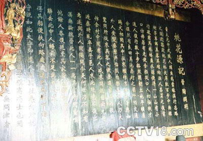 桃花源碑刻楹联极为丰富,自唐刘禹锡题《桃源佳致》并勒石为碑后。历代文人墨客,羽士高僧来此,揽物抒怀,趁兴挥毫,留下许多美妙的诗文,古人为求不朽,或勒石为碑,或刻匾成对,留传至今。这些碑刻与楹联给游人以极大的吸引力,那方寸之内的历史沧桑和文化稹殿有着无限迷人魅力。 《桃源佳致》碑 碑原为唐代文学家刘禹锡所题,原碑字迹已被时光剥蚀无存。现碑为明万历三年(公元l575年)湖广巡抚赵贤补书,隶书3行,正文“桃源佳致",字径47厘米,上款:“唐刘禹锡题,明赵贤书”,下款:“光绪二十年余良栋重修”。碑高240厘米,宽1l5厘米,厚26厘米。1980年重修碑亭,置碑于内,保存完好。