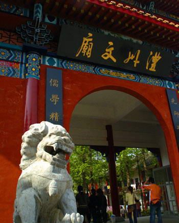 澧州文庙又名科学宫。位于城关镇文化街49号。创建于北宋乾德三年(965),明洪武元年(1368),迁今址。整个建筑中轴线上自南往北有头门、半月池(上架状元桥)、棂星门、大成门、大成殿、崇圣祠6进。 大成殿前有月台,两侧建东、西厢房和钟、鼓楼。大成门重建于清道光年间,单檐硬山式,盖黄色琉璃瓦,石基为须弥座,前后阶中央嵌砌五龙陛。东西两侧各为宦官祠和乡贤祠。大成殿与大成门同期修建,砌台阶式石基,由48根大型杉木主柱构成,高23米,顶为重檐歇山式,檐下斗拱交错。盖黄色琉璃瓦,9脊由琉璃云龙组成。崇圣祠重建于清道光二十一年(1841)。面阔三间长20米,进深四间16米,为单檐硬山式顶盖绿色琉璃瓦,祠下为石基,东、西厢房位于大成殿前,东西二侧各一栋,硬山式每栋面阔五间计20米,盖绿色琉璃瓦和茶花脊,两端饰鳌鱼吻。钟、鼓楼呈6方攒顶式,重檐12脊,檐饰翘角,顶盖黄色琉璃瓦。院落四周围有高大宫墙,占地面积4680平方米。今除头门、棂星门不复存外,其余建筑经过维修已恢复原貌。 文庙是湘西北规模最宏伟的古建筑群,湖南省人民政府1959年和1961年两次公布为省级文物保护单位,1987年澧县博物馆设于文庙内利用东西厢房耳房为展室,陈列澧县出土和征集文物,并正式对外开放。 |
