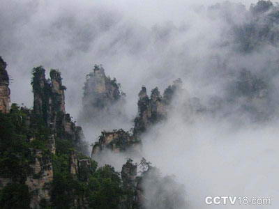 五、四大奇观 天子山还有云雾、月夜、霞日、冬雪四大奇观。云雾,是天子山最多见的天象奇观。有云雾、云海、云涛、云瀑和云彩等景象。久雨初晴之后或霏霏 细雨之中,先是朦胧大雾,继而形成白云,环绕飘浮。群峰在无边无际的云海中时隐时现,使人仿佛置身于蓬莱仙境之中。有时云雾从溪口涌出,爬过峰顶,然后以铺天盖地之势,飞泻而下,形成云瀑,十分壮观。月夜,当月明星稀,万籁俱寂时,这里的峰林被朦胧月色披上了一层“魔纱”,似一群群魔影耸立在幽谷之中。耳闻禽兽呖呖的叫声,使人产生一种神秘感。霞日,晴天的早晨,一轮红日在朵朵红云的衬托下,从奇山异峰中冉冉升起。千万座石塔,婷婷玉立,披上一层红霞,十分迷人。冬雪,入冬,天子山银装素裹,青松和峰顶被大雪复盖。此时的天子山冰柱倒立,冰花四散,只有一些山鹿、野猪,才不为银白世界所征服。 天子山有黄龙泉、风栖山、老屋场、茶盘塔、石家檐五个主要景区和数十个重要景点。 |
