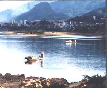 在湖南省南部,毗邻两广的零祁盆地与道郴盆地之间,巍峨耸立着阳明山、紫金山两大名山。在这两山之间,蛇行曲转着一条大河,奔涌汇入湘江,这——就是潇水河。相传,舜帝南巡,沿河而上,广施恩泽,遍布德行,至今流传着无数动人的传说。后来,舜驾崩于九嶷,百姓为纪念舜商德政,也将此河称为舜德河。 上世纪六十年代初,天遂人意,在山的出口处,修建了当时湖南第二大水利枢纽工程——双牌水库,遂将潇水河裁为二截。从此,上游形成了雄山秀水、高峡平湖的壮观景象。有诗人赞曰,“百里平湖美如画,两岸青山千层绿”,最为贴切不过也。潇水湖长约一百公里,而宽窄不一。宽处,浩浩荡荡几华里;窄处,船行而侧入;最深处,一百余米,平均也为三十米以上,库容达八个亿。沿湖上下,自然景点星罗棋布,历史古迹俯仰可拾,民俗风情异彩纷呈,是湖南及至两广仁者近山、智者乐水及广大市民休闲、揽胜,吊古的绝佳之地。 潇水湖美在自然。沿湖而上,湖水漫江碧透,上百里水面平静似镜,其水比漓江清,比西湖秀,湖面小船来往穿梭,两岸青山绿波翻滚,刀削似的岩石、如神似佛般的峰峦直插水中,“两岸猿声啼不住,轻舟已过万重山”,沿途景色美不胜收,恍若人间仙境。黄龙山座落在潇水湖右畔,相传大禹受舜帝之命治水,曾锁一黄龙于此,降服后归入大海。这里的山势似龙,龙头上的岩石上松柏苍翠。湖中有几个小岛,岛上绿盖荫护,又恰似镶嵌在湖面上的颗颗珠宝。沿湖而下,双牌大坝横空出世,库名系陶铸同志手笔。泄闸时声如虎啸,水雾弥谷;关闸时,水流如涓,静若处子。由大坝下三里处,浮洲岛侧卧河中,相传娥皇、女英寻夫舜帝,船行于此,闻舜仙逝,痛不欲生,其座船即在河中化为浮洲,托住了要跳河自尽的二位皇妃。千百年来,水涨岛浮,水退岛沉,洲上四季树木葱笼,成群白鹭在此栖息,尤以每年春天,江心上满洲桃花争红斗妍,无数艳蝶轻歌漫舞,煞是迷人。立于洲上,靓丽山城的背后青山万亩园一揽无余,“绿化祖国”四个活立木大字赫然入目,已载入了世界吉尼斯纪录。湖畔西岸有青龙、白龙两洞相映成辉,青龙洞内分三层,洞中有洞,鬼斧神工。明朝地理学家徐霞客称“余历选山栖佳胜,此为第一也”。白龙洞深不可测,其中一方圆百丈的石厅,可容纳上千人,堪称地下奇观。以上景点连点成线,风格各异,构成了潇水湖独有的自然美景。
