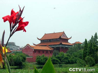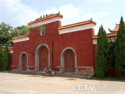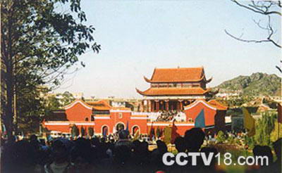 江华瑶族进入县境后,曾立有数座盘王殿,但风雨剥蚀,早已毁坏。为缅怀祖先,昭示民族传统文化,开发旅游资源,促进经济发展,根据瑶族人民的意愿,将原建于姑婆大山中的盘王殿迁建于县城沱江镇。迁建的盘王殿,座落在风景秀丽的平头岩公园内,占地21亩,地势依序为低、中、高三级,与平头岩相对应。 盘王殿座北朝南,为混凝土仿古式建筑。在宽敞的停车坪下车后即进入高8.9米的瓠圣门(由云南省政协副主席赵廷光〈瑶族〉题写),两旁是瑶家的吊脚楼。沿着拼花鹅卵石路踏上一级连着一级的青条石台阶,仿佛走进了瑶族那悠久的历史画卷中,越往前走就越容易看见瑶族先祖盘王笑容可掬地在大厅里迎接您,与君畅谈瑶族久远的历史。而后拾级而上,则是亭阁式的后殿。整座盘王殿远望错落有致,红墙琉瓦,金碧辉煌;近看雄伟、古朴、典雅,雕梁画栋,古色古香,具有浓郁的民族特色。堪称中国瑶族第一殿。 中殿是盘王殿的主体建筑,长26.2米,宽17.8米,高20.23米,建筑面积466.36平方米。正门上方“盘王殿”三个金色大字和厅内的“盘王始祖随身带,木本水源不可忘”均为全国人大常委副委员长、著名社会学家费孝通题写。厅内的盘王座像高4.5米。盘王笑容满面,和蔼可亲,其旁放有弩箭和神鼓。墙上是四幅反映瑶族历史的大型壁画,东为《盘王狩猎图》,是瑶族原始社会时期采猎经济的一个缩影;西是《飘洋过海图》,再现了瑶族先民迁徙不定的生活场面;北是《瑶族长鼓舞》和《度曼尼》,体现了瑶族丰富多彩的文化。梁上的彩绘则取材于瑶族传说故事《千家洞》和《南京十宝洞》,以及瑶山秀丽风光,内容丰富,画面赏心悦目。
