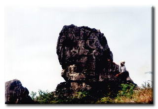 天书女字为巨上风雨侵蚀形成的天然石缝,横直数尺,笔划粗犷,形神俱备,远望如手写的巨幅行书。“女”字石极象一尊面西合掌为十的观音菩萨,相对一石如打坐古佛,前后左右数石屹立,如众僧听禅。