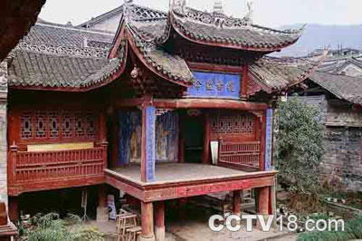 朝阳宫位于古城北西侧的西门坡,原名陈家祠堂,民国4年(1915年)由乡绅陈炳、陈开藩等发动族人捐资兴建。民国12年(1923年)时任湘西巡防军统领的国民党中将、凤凰籍人陈渠珍又率众族人扩建。至此大门、正殿、戏台、左右包厢、厨房、厕所等14间房屋浑然一体,构成了典型的南方四合院。 朝阳宫的大门为紫红色砖墙门楼,高8米。大门两旁镌有对联一副:“瑞鸟起蓬蒿翼搏云天高万里;嘉宾莅边隅眼看楼台总多情”。左右对称地堆塑山水花鸟浮雕12幅,门楼飞檐翘角,别具特色。 入大门,从戏台下穿过,即为一宽敞的四合院天井,全用方形青石板铺成,整齐有序。正面是一栋三间木结构正殿,殿基用精雕细钻的红砂条石浆砌,高出天井坪1.2米。明间前铺设有9级紫红砂石扇形石阶;内檐开圆形月拱大门,拱门四周镂冰纹花格。两边次间正面均为花格通风木窗,前有木琢栅栏走廊。这是旧时乡绅阔佬看戏之地,正殿左右两侧各建包厢1栋,均为二层3间,下层空置,供看戏者避雨,上层才是雕花木栅栏包厢,方便达官贵人看戏。整座院落。雕梁画栋,红柱碧瓦,华丽精美,雄伟壮观。特别是栅栏和花窗,工艺精细,造型别致,美仑美奂。 戏台背靠大门牌楼,与正殿相对,离地2.1米.台上正中题曰"观古鉴今",台前两侧悬挂对联一幅:"数尺地方可家可国可天下;千秋人物有贤有愚有神仙"。玄妙而又真切。台后正中彩绘福禄寿三星画,上面藻彩绘戏剧人物九幅,均是一幅一典。台顶为重檐青瓦屋面,飞檐翘角,古雅端庄。 |