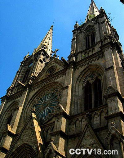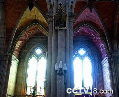 教堂建筑结构:正面一对巍峨高耸的双尖石塔,高插云霄。石塔中间西侧是一座大时钟,东侧是一座大钟楼,四具从法国运来的大铜钟;堂内是尖形肋骨高叉的拱形穹窿;正面大门上面和四周墙壁分布的花窗棂,都是合掌式,所有门窗都以法国制造的较深的红、黄、蓝、绿等七彩玻璃镶嵌。这玻璃可避免室外强光射入,使室内光线终年保持着柔和,形成慈祥、肃穆的宗教气氛。