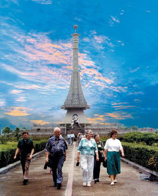 北回归线标志塔位于从化太平镇太平场油麻埔(北纬23°36’28”44)的一块海拔25.6米的坡地上,它以特殊的北回归线地理位置著称,是目前世界上南、北回归线高度最高、规模最大的标志塔。 所谓北回归线,就是太阳能够垂直照射到地球上的最北纬度线。每年夏至日,太阳直射该线位置,随后向赤道方向移动,它是热带和北温带的分界线,具有特定的地理含义,在地理学、气候学、生物学、农业科学方面,都具有重要意义。在从化设立北回归线标志塔,其目的是教育人们、普及科学知识、让所有人都来关心科学,热爱科学。 北回归线经过地球上16个国家和地区,这些地方大多数是位于沙漠、半沙漠、干旱地带,而北回归线经过我国的云南、广西、广东、台湾,部是自然条件优越,雨量充沛、生物资源丰富的地方,如云南西双版纳、广东肇庆鼎湖山等,都有“北回归线上的绿洲”的美称。我国现在已有5座北回归线标志塔,分别是台湾嘉义、台湾花莲、广东封开、广东从化、汕头,是世界上北回归线标志塔最多的国家。 从化太平场的北回归线标志塔在1984年12月15日动工,1985年12月17日竣工,由广州市人民政府立,从化县人民政府承建。 这个宏伟的工程由标志塔、石碑、场地布置和附属设施等部分构成,占地面积有28亩。主体部分是混凝土花岗岩混合结构,由230多种共7310块花岗岩砌成,总高度是30.4米。塔身形状好似一枚火箭,直指蓝天,正面刻着贴金的“北回归线标志”六个大字,高度是23.5米,与北回归线纬度相一致,更具有科学性。四周有四个突出的羽翼,显示出东南、东北、西南、西北四个方向。 塔顶是一个直径1.2米的空心铜球,用不锈钢筒承托着。在每年夏至日的中午12时26分,太阳光线会透过铜球的圆孔直射到塔内正中点,我们可以在塔内观测到这一现象。这个时候,如果站在塔外东西两门的直线位置上,你会发现自己的影子消失无踪,这是由于太阳直射的结果。 塔基用花岗岩砌成了三层台阶,第一、二层台阶的栏杆是方形,第三层是半圆球形,具有古人所谓“无圆地方”的含义。每层的台阶各有九级,取“长长久久”的意思。这种设计,使北回归线标志塔更加具有我国的民族特色。塔底相对称有东南西北四个门,正对南北极的方向,而东西两门正是北回归线经过的地方。塔的东面台阶下有一块石碑,高2米,宽0.9米,刻着《广州北回归线标志》碑文,是广州市人民政府在1985年12月17日时立的。 北回归线标志塔范围的道路模拟地球上的主要地理标志线,有赤道、南北回归线、南北极圈三条纬线及子午线等,并模拟的纬度带上种植了温带、热带的代表性植物。 北回归线标志塔使我们能更多地了解、熟悉地理学、天文学的知识,促使我们更好地学习科学、热爱科学,以实现科技兴国的战略目标。 |