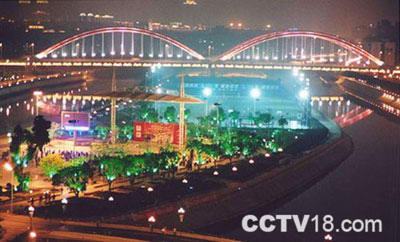鸿福桥与宏远大桥飞架于东江南支流与东莞远河之上。 每当红日高照,双桥倒影,仿如两道长虹。入夜,华灯璀璨,双桥上下灯光盏盏,有若串串明珠; 两河碧水,波光粼粼,仿如双龙戏水。两堤四岸,红灯高挂,绿柳低垂; 广场里外,霓虹四射,把双桥中间的南城文化广场映照得斑斓夺目,气象万千。广场北部篮球场、足球场、网球场一字排开,撩人遐想宏远男篮 CBA 夺冠之雄姿,南城足球队驰骋绿茵之身影。中部文化活动区,无遮盖式的中心舞台时有演出,或长袖轻纱,轻盈袅娜;或豪放粗犷,热情奔放,广场内群众轻歌曼舞,韵律操矫健优美,集体舞节奏明快,尽显南城儿女之时代风姿。桥上车水马龙,广场上蹁跹舞影。灯光、舞影、绿树、清流尽入画图中。 |