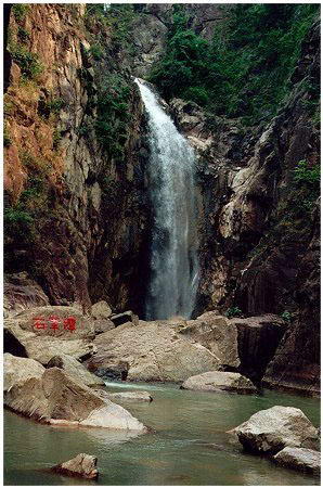 蛮陂头之水下陂北流半里,陡然没落,下面就是石笔潭。石笔潭中的石笔高几丈,象枝毛笔倒竖水中,直指蓝天。 石笔前面,左右两面山势紧迫,有小石潭(前潭)阻住去路,深可没人。靠左边走手攀山边石,脚踏潭底石,摸索以渡;涉水几步,即登对岸。转入石笔后,别有一洞天:十几丈长、四五丈宽的谷地,到处巨石夹清流; 左右两边,几十丈高山壁立;正面山凹,一条瀑布漂下潭——它就是后潭。后潭潭水甚清,也看不见底;几丈瀑布漂下,也激不起巨浪。身临潭边,如雨的水珠满头,如雷的水声满耳;寒气迫人,不能久留。有台蛮公路直达,交通方便,是台山市著名的旅游景点,每“清明节”、“重阳节”游人特别多。 |