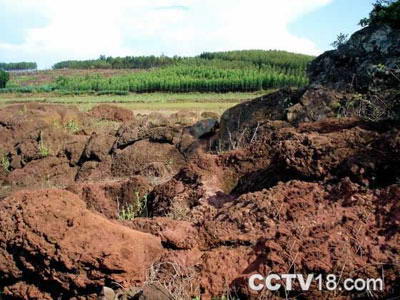 (石门玉立)石门岭在徐闻县城西北面约5公里处,登县城高楼顶,就可一睹其近似圆形的环状火山口芳容。石门岭为徐阳八景之一,因岭上有二巨石对峙若门而得名,旧县志美称为“石门玉立”。岭海拨约33米,方圆五平方公里。岭顶为一椭圆形凹地,长300米,宽110米,深10米。火山凹地内聚集有火山红泥,北边有一塌破口,东西南三面屹立着气孔状玄武岩、渣状玄武岩、火山角砾岩等组成丘状山地,经专家考证认定,石门岭是一个经过多次火山喷发活动的中心式塌陷火山口。