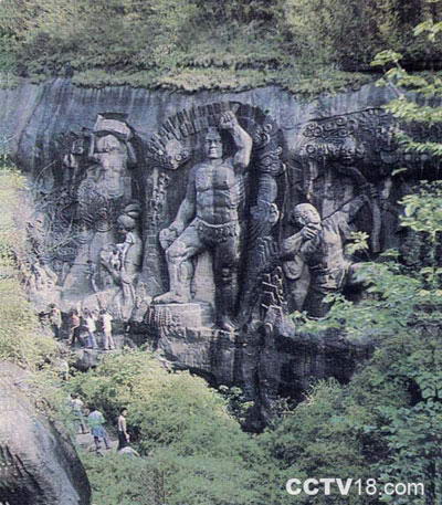 岭上至今仍留有许多与洪宣娇的传说和有关遗迹,在点将台上矗立着一尊高大的洪宣娇塑像,她手护战刀,英姿飒爽,注视着前方的练兵场。太平军女兵驻守金鸡岭时,这些巾帼英雄就常在此演武。当年洪宣娇女兵放兵器的岩洞又名别洞,奇特之处在于山外有山,洞中有洞,洞内过去用于储藏兵器,现在是长86米,共分16组的石刻,记叙了洪宣娇进驻金鸡岭抗清斗争的故事,图文并茂,浮雕艺术精巧,人物形象生动逼真。离兵器岩百余步,是“观景亭”,游人到此,豁然开朗,每当曙光初照,可看到仙山列阵迎远客之媚态,丹霞棒出红日来的胜景。这里一年四季,景色不同,一日之中,早晚各异。在山庄后的山谷间,就是宣娇阁,浓荫遮天蔽日,是个难以寻觅、极为隐蔽的地方。相传洪宣娇驻守金鸡岭时,在这商计军机大事。诗人李汝伦游此,命名“娇阁言兵”,并赋诗一首:“绝岩森壁诱旗飘,女将军前略试刀,谷底风随歌未已,宣娇堪作吾民娇。”在摩崖峭壁上,以《盘古开天地》、《女娲补天》、《后羿射日除兽》组成我国神话传说的《华夏魂》,高14米、宽20米的大型摩崖石雕。百步天梯之下,是地势隐蔽的狭谷,传说金鸡的配偶就选择这块地方下蛋,故称蛋谷。母鸡把孵出的小鸡,一群群地带往外地安家落户,繁衍子孙。乐昌古佛岩的“鹰扑鸡群”一景,有人说就是它他的后代。 |