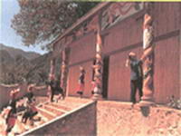盘王古庙处在黄家冲与六联水的交汇之处,最早建于1300多年前,现在所见是数年前重修的,庙的四面高山环拱,山上是沿山坡叠建而上、一排接一排的瑶寨(又称“瑶排”),比较繁盛的大排有瑶龙、黄家冲、马头冲、涡水、六联等,环绕在盘王庙的四周,有如众星捧月。随着瑶族进一步发展壮大,后分散到较远的8座山头,又再分散到24个山涌,才形成今天“八排二十四涌”的格局,但瑶胞们始终不会忘记此处祖寨,经常会来祭祖祈祷,每隔三五年,还会组织较大规模的“耍歌堂”,共同祭祖祭神。 |