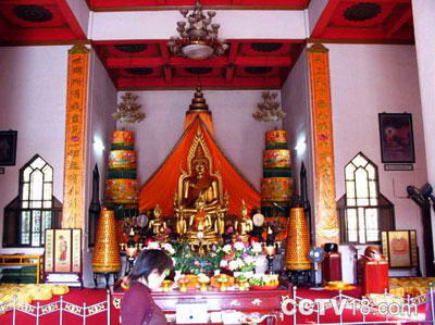 大殿正中供奉泰式释迦牟尼佛,称清拉佛像,尖顶毛发的装束与开元寺汉传释迦佛大为不同,为螺旋火焰装。这尊高3米,重1.5吨的青铜佛像,表面贴金箔,称为金佛。墙壁四周是图画“佛陀的故事”,主要是讲述释迦佛祖的出生,得道成佛及涅磐的过程。