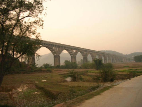 罗平长江坡渡槽是引罗定太平河,罗镜河之水入蓄金银河水库的关键大型建筑物,全长5200米(包括砌石拱渡槽1750米),槽宽6米,高2.2米,两边设有行人道。该渡槽为连拱结构,共132跨,拱的最大跨度51米,最大高度37米,过流水量为每秒25立方米,于1981年1月竣工并通水。 |