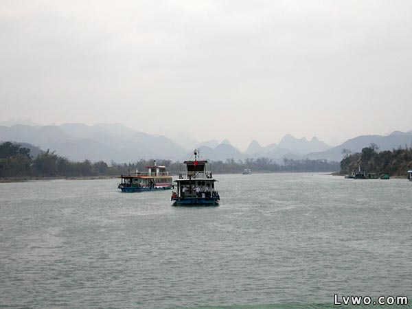 沿漓江从桂林到阳朔,水程约83公里,可分三段: 桂林--杨堤,全程46公里,航程4小时。风景点离航道较远。距桂林较近的有象鼻山、塔山(剑山)等。隔江对峙的有东岸的穿山与西岸的龟山,形如隔江相斗的两只雄鸡。 杨堤--兴坪,全程17公里。航程约40分钟。这里是山水风景最佳的一段。许多风景名胜就在漓江岸边。例如著名的半边渡,渡口山壁如削,为世所罕见;二郎峡两岸山峰奇立,瀑布高挂;画山平直如削,石壁上显出白、黄、灰、黑等颜色,浓淡相间。船过四望,现出九匹马形,俗称九马图。