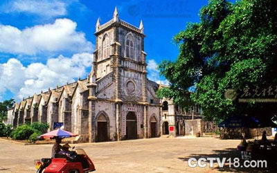 在高空鸟瞰,面积为25平方公里的涠洲岛犹如一枚翡翠漂浮于湛蓝的大海中。踏上这座火山岛,撞入眼帘的是奇特的海蚀海积地貌与火山熔岩景观——猪仔岭憨态可掬,鳄鱼石栩栩如生,滴水岩泉水叮咚,红色火山岩好象刚刚喷发过……位于盛堂村的法国天主教堂,更是在19世纪末就落户岛上,材料全部取于岛上的珊 瑚、岩石,历经百年岁月,依然坚固如初。四百多年前,明代著名戏剧家汤显祖游览该岛,写下“日射涠洲廓,风斜别岛洋”的诗句。
