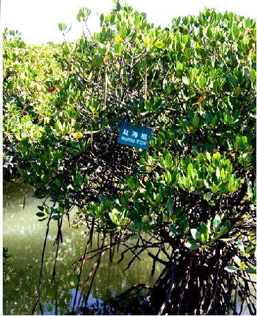 退潮后的英罗港,由红海榄树组成的原始森林,树高8米,树冠茂密,盘根连冠,交错成片,蔚为壮观。涨潮时,树冠隐于海水之中,人们可海上泛舟绿叶梢头,群鹤惊起,别有情趣。是一处新游览景区。 红树林幽秘神奇、倚海而生,随潮涨而隐、潮退而现,是国家级海洋生态保护区,同时又是联合国教科文组织人与生物圈保护区。