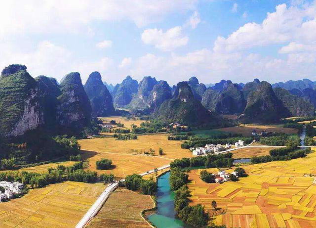 明仕田园风光,位于大新县城西南约53公里处,为国家一级景点。方圆20公里的景区,明仕河曲折盘旋,河两岸或层峦阵列,或群峰竞秀,或峰林疏落,或平坦开阔,山清水秀,山环水绕,素有小桂林之称。尤其明仕桥一带,翠竹绕岸,农舍点缀,独木桥横,稻穗摇曳,农夫荷锄,牧童戏水,风光俊朗清逸,极富南国田园气色。