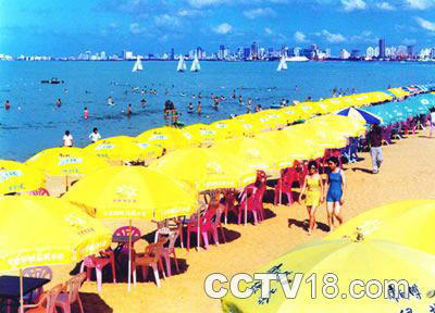 该海滩沙滩日浴区已建成开业,建有音乐喷泉广场、海水浴场,淡水冲浴房、饮品中心、生态广场、停车场、溜冰场、水上世界,还有摩托艇、帆板和冲浪等水上游乐运动以及沙滩排球、旱冰等文体活动。别具古罗马建筑风格的水上表演馆,常年邀请欧美精英表演水上芭蕾、高空跳水、陆地风情舞,精湛而又惊险、刺激的娱乐表演项目,使中外游客赞不绝口。